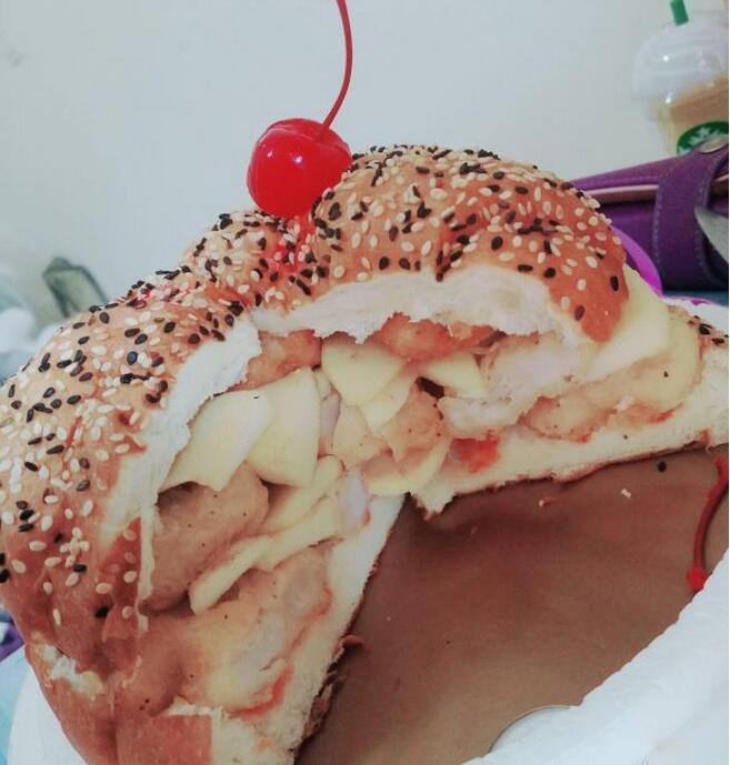 没想到,当原PO一打开蛋糕盒子后,竟发现裡面的蛋糕竟是芝麻麵包夹著鸡块所製成,而且原PO妈妈还因为担心会太腻,特地放上水果,让原PO相当感动,感性地说:「谢谢妈咪 我爱你!」。