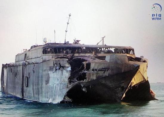 上周遭“努尔”导弹击中后几乎完全焚毁的阿联酋海军“快速”号运输舰,虽然因为双体船水下的浮力体未受损而未被击沉,但已经没有任何修复价值