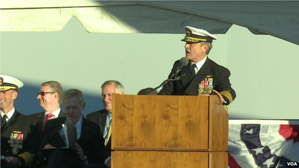 10月15日,美国海军部长雷·马布斯(Ray Mabus)出席了“朱姆沃尔特”号的大型成军仪式,他声称“这艘船是维护美国战略优势的一个重大举措”。马布斯说。 “我们独一无二的海军和海军陆战队将继续在全球各地存在,提供全天候的稳定性保障,让我们的盟友放心的盟友,阻吓对手,并提供国家领导者在危机时期的选择”。