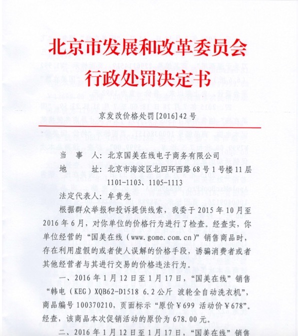 国美在线被北京发改委罚款20万元 因虚假价格诱导消费者