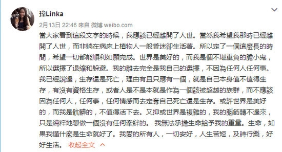 而在13日,该微博通过自动发佈,发出最后一则信息,疑似为刘薇薇的遗言,她写道:「当大家看到这段文字的时候,我应该已经离开了人世。当然我希望那时候我已经离开了人世,而非躺在病床上的植物人一般昏迷却生活着。所以定了一个这麽长的时间,希望一切都能顺利完成。世界是美好的,而我是个不堪重负的胆小鬼,所以选择了退缩和躲避。我的离去完全是我自己的选择,不因为任何人任何事。我已经说过,生存还是死亡,理由有且只应有一个,就是自己本身值不值得生存,有没有资格生存。或者人是不是本就是作为一个该被超越的种群,而不应该因为任何人,任何事,任何情感而去定夺死亡还是生存。或许世界是美好的,而我是肮葬的,不值得活下去。又抑或世界是複杂的,我的脑筋转不过来,只是纯粹地想做一个没有任何牵绊的。我无法承受生命给我的重量。生命,如果我懂甚麽事生命就好了。我爱的所有人,一切安好,人生苦短,及时行乐,好好生活。」