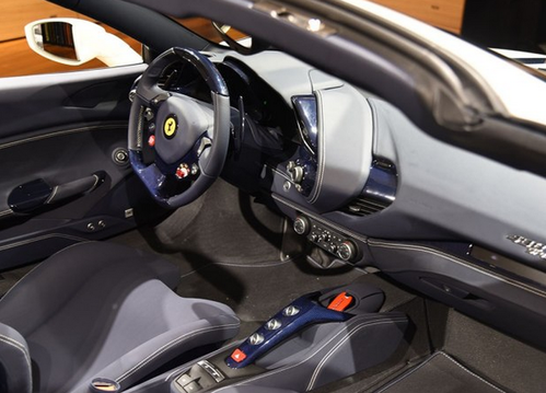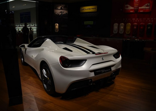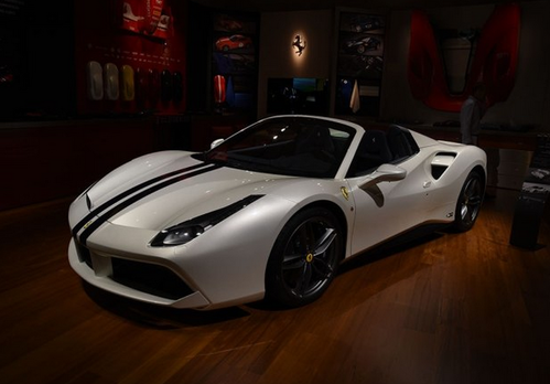 这款488 Spider特别定制版车身整体采用了白色车漆,并带有蓝色的双条拉花,其涂装风格与1953年的法拉利375 MM Pinin Farina spider保持了一致。
