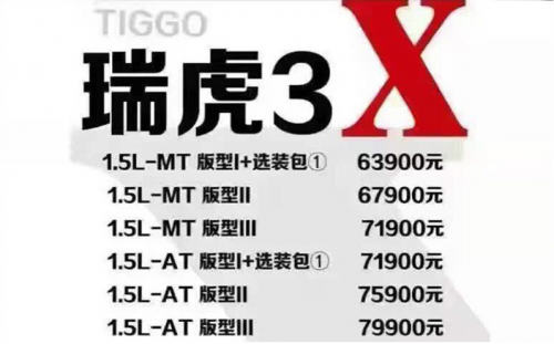 在动力方面,瑞虎3X使用了1.5L发动机+5MT/4AT的动力组合,1.5L自然吸气发动机最大功率78kW,手动挡车型的百公里综合工况油耗为5.9L。
