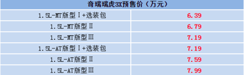 据奇瑞内部人士透露,一组疑似瑞虎3X的官方预售价格曝光,新车将推出六款1.5L动力配置的车型,预售价区间为6.39万-7.99万元。根据此前消息,该车有望于本月30日正式上市。