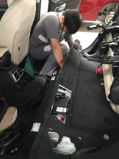 检测燃油泵电源需把第二排座椅都拆掉,技术员也不保护新车环境,直接穿脏鞋施工。