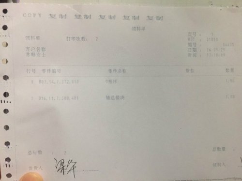 于是我要求销售顾问去拿备件出库单跟关单给我看。下图是出库单(不知道是不是真的)。