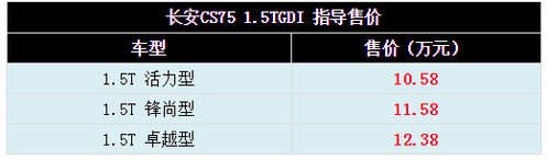 动力方面,本次上市的长安CS75 1.5T车型最大的特点就是这台新搭载的1.5L涡轮增压发动机了,它的最大输出功率为170马力(搭载2.0L和1.8T发动机的CS75的最大功率分别为158马力和177马力),超过了现款CS75 2.0L车型的158马力,而这款1.5T发动机的峰值扭矩则达到230N·m。传动方面,这次的三款新车型全部配备了6速手动变速箱,至于自动挡车型何时推出,还要等待进一步的消息。