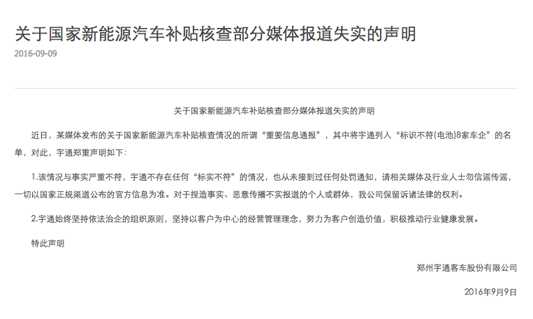 不过,9月9日,比亚迪和宇通客车均声明称,未收到任何关于公司涉及新能源骗补的处理或处罚决定。