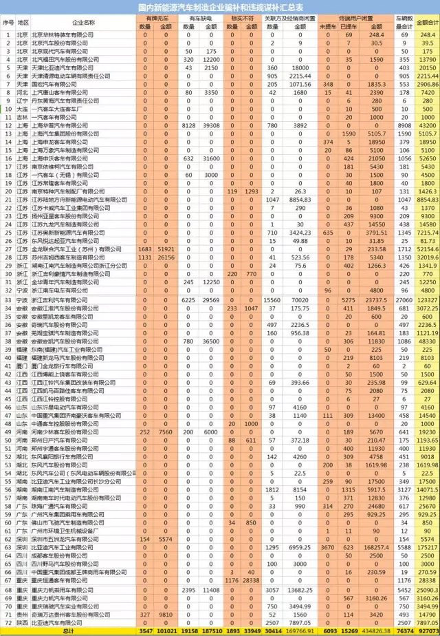 财政部等四部委共调查了93家企业,这份名单显示72家涉骗补,上述涉嫌骗补和违规谋补的车辆总数达到76374辆,涉及补贴总金额92.7073亿元。
