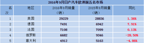 上个月,欧洲市场中,销量五强分别为英国、德国、法国、俄罗斯和意大利,俄罗斯再次登上五强榜。其中英国仍然处于榜首位置,销量为29,229辆,远远高于其它欧洲国家市场,同比增长1.3%,市场份额达5.5%;五强市场中,俄罗斯销量下降程度最大,9月共销售6682辆,同期相比骤跌近三成。意大利销量也有所下跌,从去年9月的5163辆下降到4912辆,下跌近5个百分点。