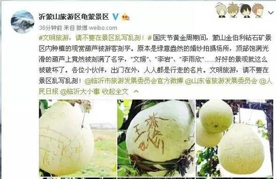 国庆节到啦,外出游玩儿的人会剧增,亲朋好友结伴而行,观名胜,赏风景,其乐融融。但在各地旅游景区,总有一些游客的不文明行为,在破坏美丽风景的同时,也影响着其他游客的心情。在临沂某景区就被人爆出不文明!