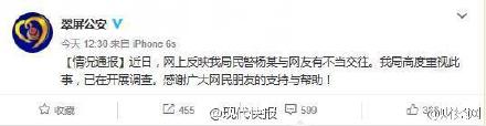 昨天下午,记者在杨某微博留言,对于网传情况是否属实,杨某尚未作出回应。同时,记者多次致电宜宾市公安局翠屏分局,电话一直无人接听。目前,网友们的说法尚未得到警方证实。
