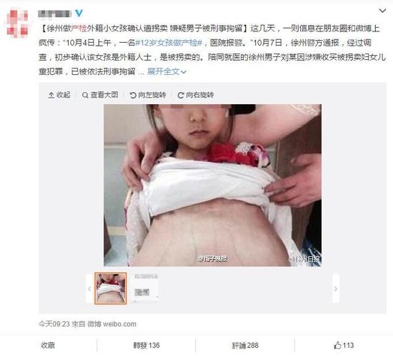 10月4日中午,徐州市泉山分局奎山派出所接到报警,称在徐州市中心医院,有一名12岁小女孩在一男一女陪同下做产前检查,怀疑该女孩是被拐卖的。10月7日,徐州警方通报,经过调查,初步确认该女孩是外籍人士,是被拐卖的。陪同就医的徐州男子刘某因涉嫌收买被拐卖妇女儿童犯罪,已被依法刑事拘留。
