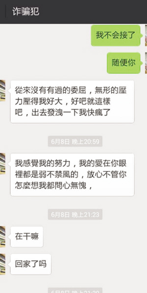 “天天都找我聊天,每天上午就开始聊,从早上聊到晚上,关心我,关心我的家人。”黄女士回忆那段时间,现在想起来对方从开始就下了一盘很大的棋,“什么都关心,你吃饭没有呀,你出门带墨镜没有呀,你带伞没有呀。”即便是在深夜,暖男还在不停地“关心”她。
