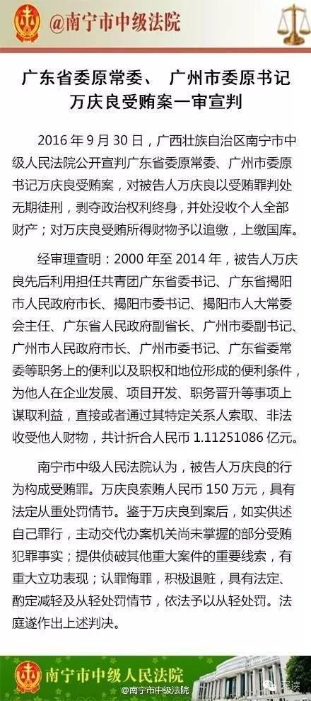 2016年9月30日上午,广西壮族自治区南宁市中级人民法院公开宣判广东省委原常委、广州市委原书记万庆良受贿案。
