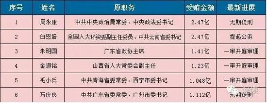 深读(微信ID:shenduzhongguo)根据公开报道统计,在已经被提起公诉或者被判决的案件中,受贿金额过亿的官员至少有6人,其中2人已被判处无期徒刑,为周永康和万庆良。3人已开庭受审,1人被公诉(下表)。