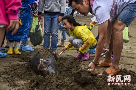 短短十几分钟,垃圾袋就鼓了起来。这时,有一个孩子忽然叫起来,原来,沙滩上躺着一只已经死亡很久的小“海豚”。爸爸妈妈们查阅资料后判断,这不是海豚,而是濒危的国家二级保护动物长江“江豚”。小江豚躺在沙滩上,浑身被一个黑色塑料袋缠绕,脖子和肚子的部位都有明显的伤口,身体已经开始腐烂。“闻上去已经有些臭臭的,但是我们大家还是都围了上去。不过它的皮肤都烂了,我们甚至都没有找到它的眼睛。”看到这一幕,欣欣一下就哭出了声。