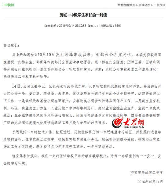 10月10日的爆炸让家长和学校本就紧张的神经再次绷紧,远离制药厂的呼声再次高涨。昨天晚上,历城二中在其官方网站上发布《历城二中致学生家长的一封信》,信中称,按照规划,历城区拟将历城二中迁建至唐冶新区,并按照打造百年名校的目标,在学校搬迁过程中,确保教育教学质量不降低,确保教师利益不受损,确保师生有更好的工作学习环境。新学校将在今年年底开工建设,一年半建成搬迁。同时,环保、安监部门成立工作组,入驻历城二中和制药厂,实时监测监控企业生产,直到二中完成搬迁。