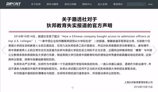 路透社在文中还引用了狄邦2015年的广告语——“一年仅此一次,在职招生官将成为你的独家顾问。”