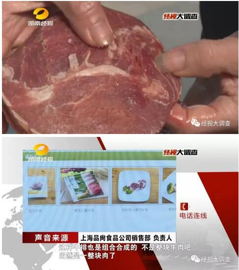 “都是整块肉切割而来!绝对没有拼接”!在记者之前的调查中,这是听到的最多的保证。上海“品尙”食品公司的宣传册上明确注明:欧洲标准,原料整切!包括上海品尙食品公司的销售人员,也曾这样信誓旦旦表示他们的牛排都是一整块牛肉。