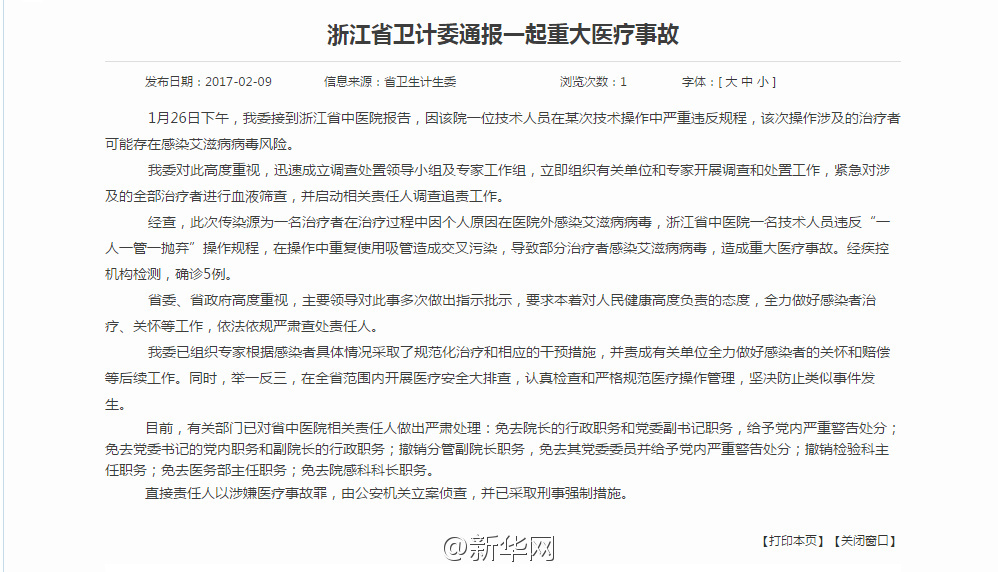 浙江省发生重大医疗事故 5名被治疗者医院感染艾滋病病毒