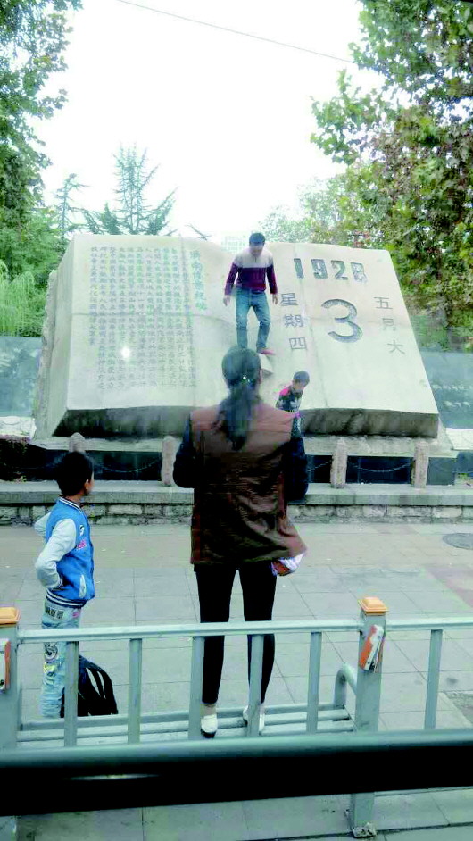 游客携子爬五三惨案纪念碑 阻止后继续拍照