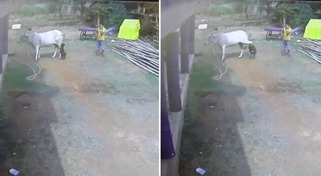 印度一学步女童抱牛后腿被踢飞 父亲一旁傻看