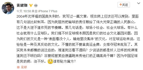 随后他又写道,“2004年沈祥福的国奥失利时,我写过一篇文章,现在网上应该还可以搜到,里面有几句话比较刺耳,因为我居然把输球的责任赖给了伟大光荣正确的人民群众,这不是大逆不道作死的节奏嘛。那几句话是:球场小社会,社会大球场。有什么社会就有什么足球队。我们搞不好足球根本原因是我们的社会文化基因问题,因为我们的文化是一种‘表面看没个人,暗地里没集体’的文化,对足球运动来说,这恰恰是一种及其反动的文化。