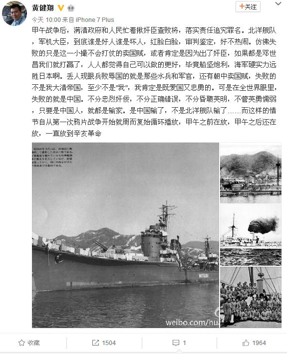 黄健翔先是在微博上疑似用甲午战争讽刺现状,他写道,“甲午战争后,满清政府和人民忙着揪奸臣查败将,落实责任追究罪名。北洋舰队,军机大臣,到底谁是好人谁是坏人,红脸白脸,审判鉴定,好不热闹。仿佛失败的只是这一小撮不会打仗的卖国贼,或者肯定是因为出了奸臣,如果都是邓世昌我们就打赢了,人人都觉得自己可以做的更好,毕竟船坚炮利,海军硬实力远胜日本啊。丢人现眼兵败辱国的就是那些水兵和军官,还有朝中卖国贼,失败的不是我大清帝国,至少不是"我",我肯定是既爱国又忠勇的。