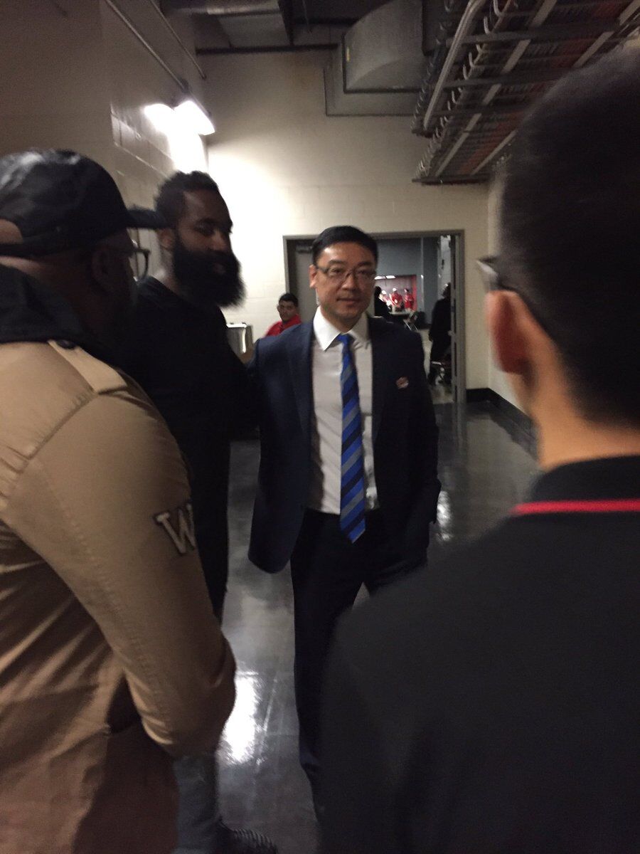哈登赛后前往上海队更衣室 和对手合影留念