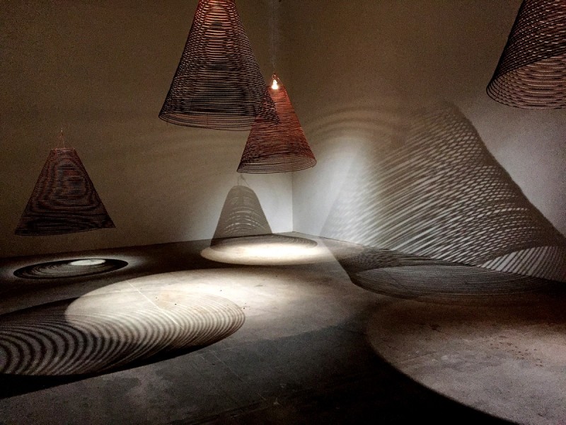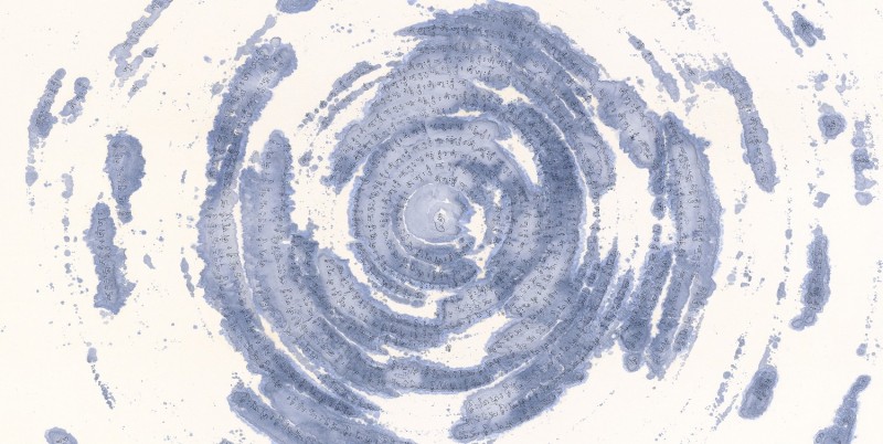 《香环咒──莲师祈愿》以佛教寺庙常见的香环为素材,将莲师心咒逐字手写于香环上,有如透过此一过程默念经文,体现佛教的空虚概念。展览使用的香环由台南制香厂手工制作,且为搭配展览空间及颜色,以藏青色呈现,经文则以银漆书写。