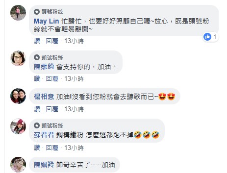 大批黄文星的“头号粉丝”挤爆他的脸书,留言“既是头号粉丝,就不会轻易离开”、“钢构铁粉,怎么逃都跑不掉”、“绝对不会!我都喜你6-7年了”,还有人猛亏他:“想多了,头号粉司只会愈来愈多。”人气有增无减。
