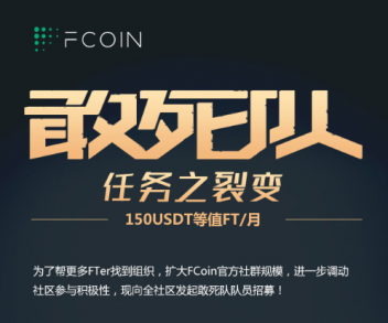 值得注意的是,FCoin 社区近日还流传一张“敢死队”招募令海报。根据海报内容显示,FCoin 社区正在扩大官方社群规模,优先招募有社群管理经验者,考核通过者可每月获得与 150 USDT 等值的 FT。