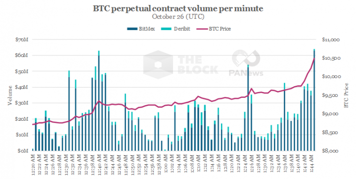 BitMEX 和 Deribit 的永续合约交易量在币价飙升前几分钟,大约 3 点 40 分左右就开始逐步上升。