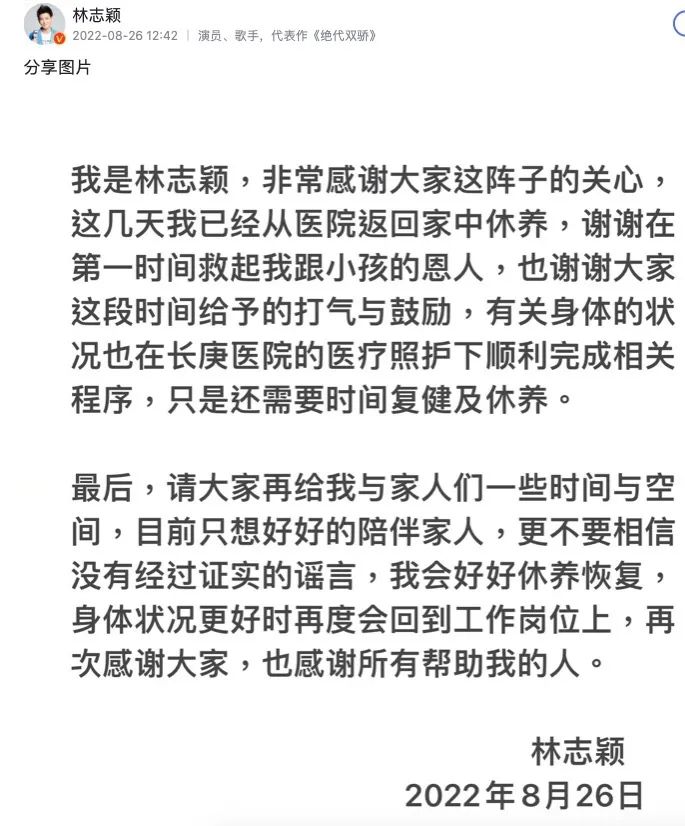 事故发生后在医院呆了一个多月,2022年8月26日林志颖发文报平安:已返回家中休养,并表示特别感谢热心民众协助脱困。