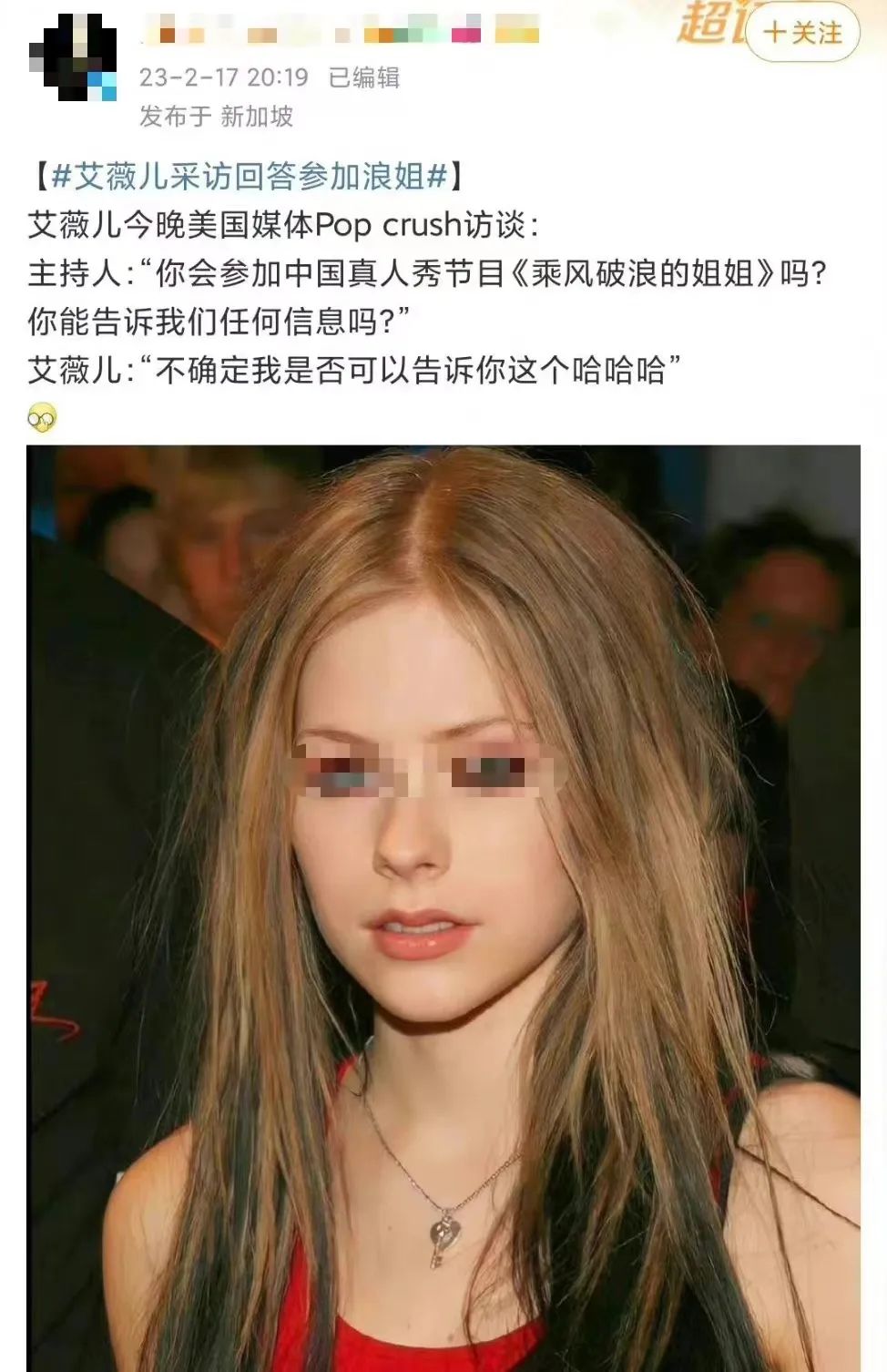 今日,本人回应终于来了!据外媒报道,艾薇儿.拉维尼在17日的采访中被问到是否会去参加中国的综艺节目《乘风破浪的姐姐》,艾薇儿当面否认了该传闻:“这不是真的,这就是我能告诉你的,我从来没有听说过,不是真的,这很有趣”。