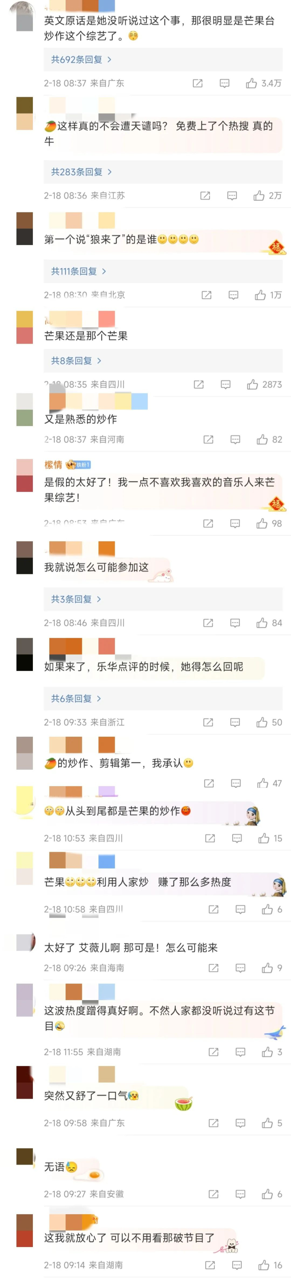 今日一早该消息便直冲微博热搜榜2,此消息一出也是引得不少网友“破口大骂”!热搜词条下基本清一色的称🥭台是懂得炒的,表示:“英文原话是她没听说过这个事,那很明显是芒果台,炒作这个综艺了。”、“这样真的不会遭天谴吗? 免费上了个热搜 真的牛”、“第一个说“狼来了”的是谁”、“芒果还是那个芒果”、“又是熟悉的炒作”、“是假消息可太好了! 不喜欢我喜欢的音乐人来芒果综艺”、“芒果的炒作、剪辑第一,我承认”...“这波热度蹭得真好啊。不然人家都没听说过有这节目”......