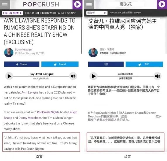 直到2月17日艾薇儿参加的是电台直播的访谈时,被问到是否会参加浪姐,然后就有外网粉丝发文翻译,表示艾薇儿回答称:不确定我是否能告诉你这个。随后这断访谈的相关话题#艾薇儿采访回答参加浪姐#迅速登上微博热搜,引发全网热议,昨日,网友还以为这可能涉及保密协议,如此一来,已经是相当于默认参演,一时间网友期待值估计都拉满了,没想到如今竟是个乌龙!!