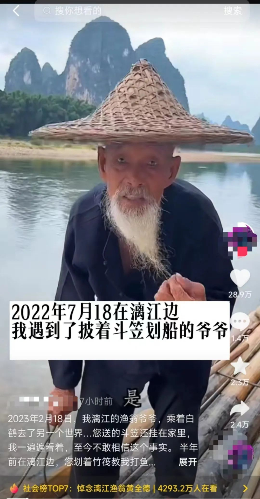 2月18日晚,广西桂林阳朔县漓江景区抖音官方发布视频称,20元人民币上的渔夫“原型”黄全德老爷爷于18日凌晨4时已离世,享年94岁。