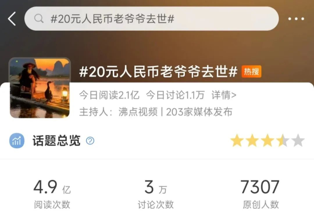 此消息一出,#20元人民币老爷爷去世#的搜索词条直冲上了微博热搜榜单,截止出稿前,话题总阅读次数高达4.9亿,各地网友纷纷缅怀,晒出曾今一起拍的合照等等...