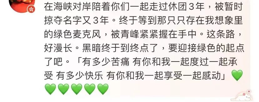 在海峡对岸陪着你们一起走过休团3年,被暂时掠夺名字又3年。终于等到那只只存在我想象里的绿色麦克风,被青峰紧紧握在手中。这条路,好漫长。黑暗终于到终点了,要迎接绿色的起点了吧。「有多少苦痛 有你和我一起度过一起承受 有多少快乐 有你和我一起享受一起感动」💚💚💚💚💚💚