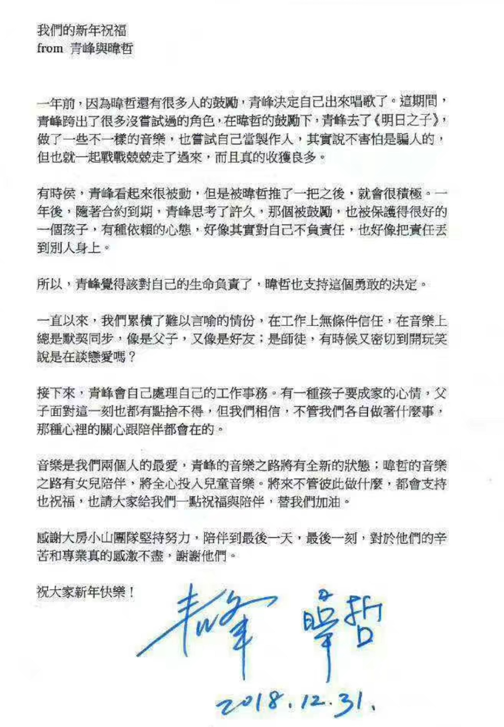 18年吴青峰就和违者发表联合声明,表示双方已经“和平分手”