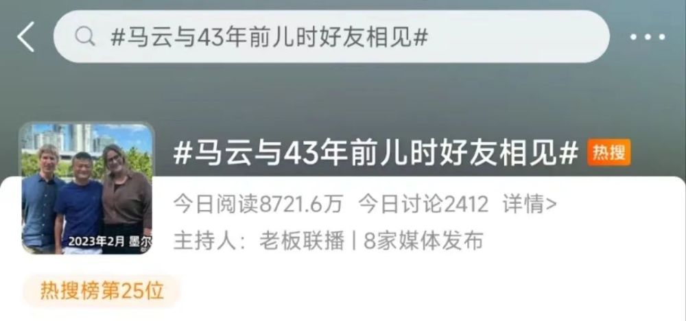 呐!这不,现身澳大利亚,其相关热搜话题#马云与43年前儿时好友相见#即刻登上热搜榜单!从这我们就可以看出,此行相见好友也是马云现身澳大利亚的原因之一啦!!