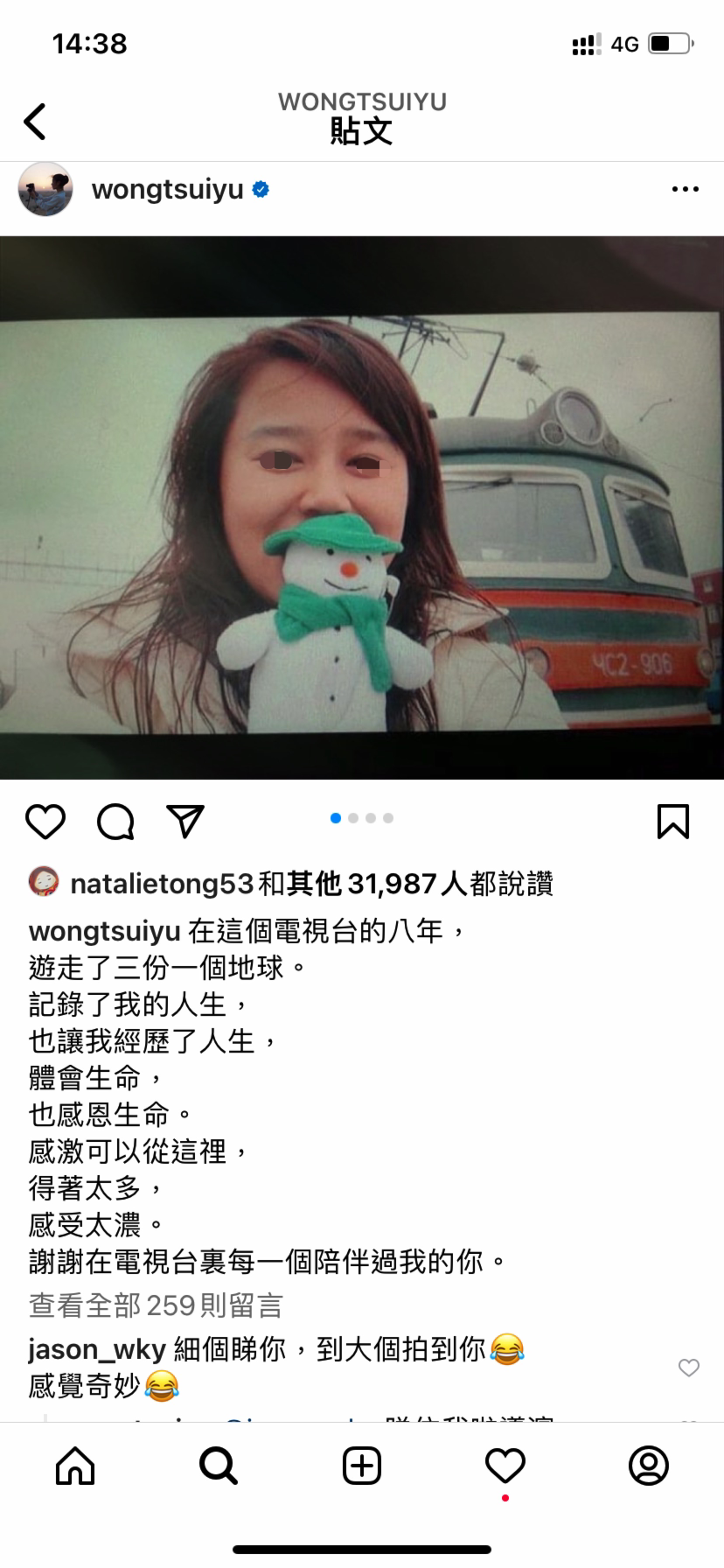 黄翠如从03年开始就在有线担任新闻主持,后来作为旅游主持,参与了《40日峰狂叹世界》,《活得很滋味》,《地平线上这个世界那些人》等旅游节目,后来在TVB拍摄《幕后玩家》的剧集备受喜爱。她也在ig感叹道,在有线的八年中游走了三分一个地球,同时感谢有线电台,让她学会了很多。