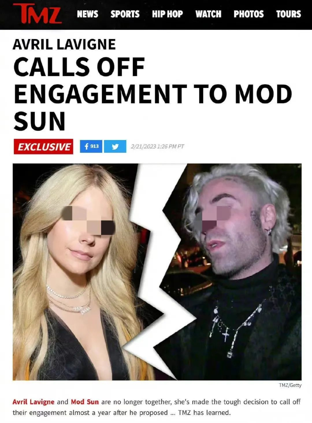 2月21日,有外媒爆料称,艾薇儿与未婚夫Mod Sun已经取消婚约并分手,微博也闪现#曝艾薇儿取消婚约#的相关热搜词条。据知情人士透露,自2022年4月宣布订婚,并举行订婚派对后,两人还在去年8月,一同参加MTV音乐颁奖典礼,没想到之后两人感情就急转直下,在过去几个月里两人一直分分合合,但还是没能重修旧好。
