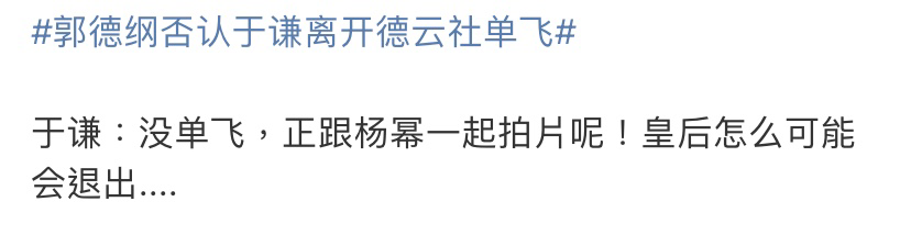 所以网友们借此猜测于谦是否已经离开德云社单飞了而在最近的相声大会上,社友也问道为什么最近的都没看到于谦老师和你一起出现,郭德纲则戏谑的表示,余老师忙着和女演员拍戏,没空;