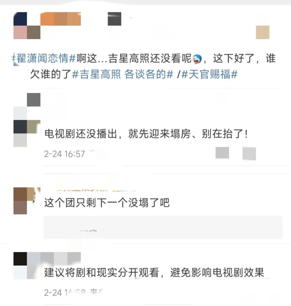 众多网友本以为翟潇闻会是唯一一个努力搞事业的,没想到还是被曝已恋爱,有网友表示:“剧还没看呢,这下好了,谁也不欠谁的了”、“电视剧还没播出,就先迎来塌房、别在抬了!”,还有网友表示:“建议剧和现实分开看,以免影响电视剧效果”(hhh~你是懂看剧的)