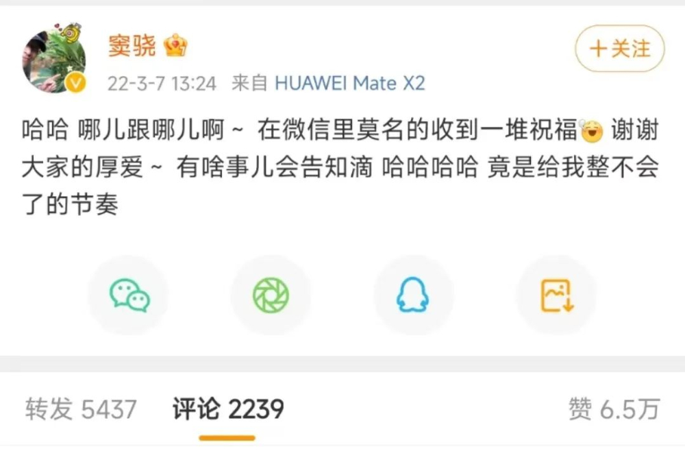 在往前推推就更加离谱了,去年2月份有媒体报道称两人奉子成婚,其聘礼价值10亿,在得知奉子成婚消息之后,窦骁立即发文回应辟谣:“哪跟哪啊,微信莫名收到一堆祝福,感谢大家的厚爱~有啥事会告之滴,竟是给我整不会了的节奏。可见,看到这个消息的属实让窦骁一脸懵”。