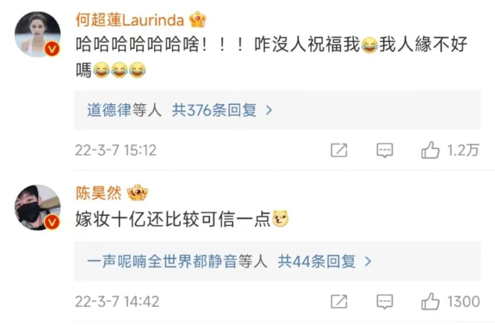 何超莲还在窦骁下面评论道,咋没人祝福我,我人缘不好吗?陈昊然更是打趣说到,嫁妆十亿还比较可信,从这些互动来看两人的感情还是十分稳定的。