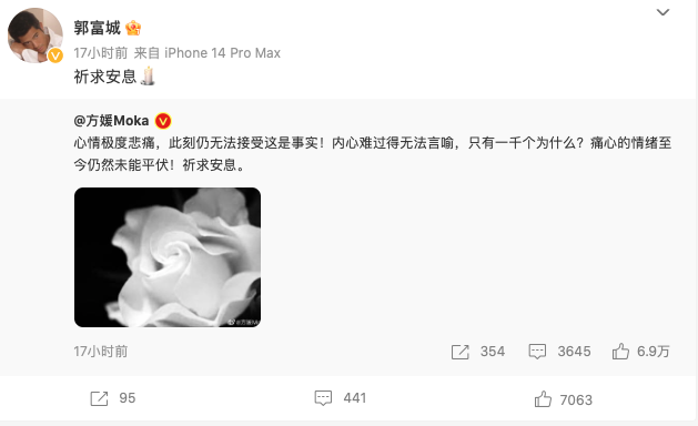 26日晚间9点,死者好友方媛曾发文悼念蔡天凤:“心情极度悲痛,此刻仍无法接受这是事实!内心难过得无法言喻,只有一千个为什么?痛心的情绪至今仍然未能平伏!祈求安息”。随后,好友丈夫香港四大天王之一的郭富城也转发了悼念微博:“祈求安息”!